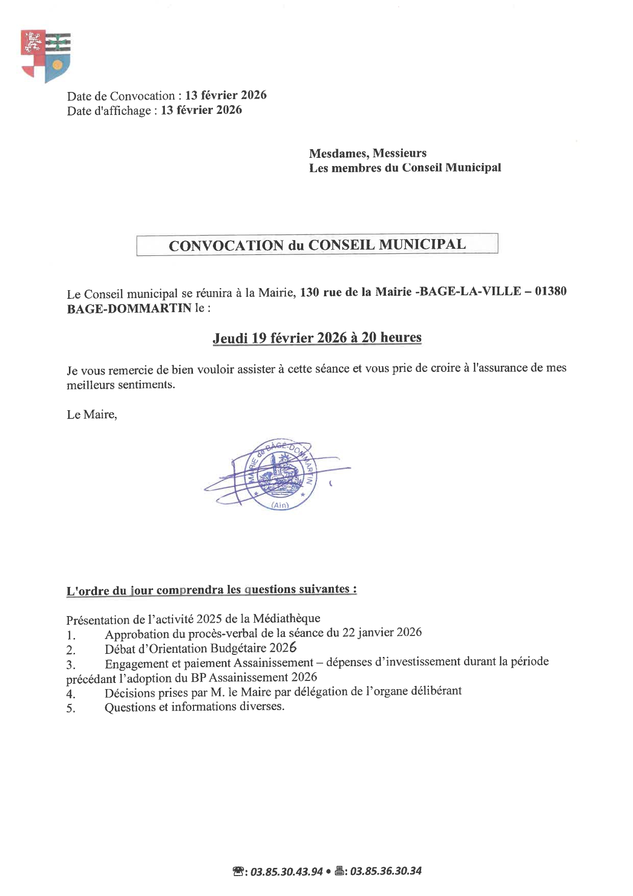 Prochain Conseil municipal jeudi 19 février 2026 à 20H